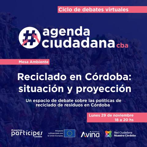 Desde el espacio “Seamos partícipes” te invitamos al quinto debate del ciclo #agendaciudadanacba: Reciclado en Córdoba: situación y proyección. El encuentro será el lunes 29 de noviembre de 18 a 20hs.
