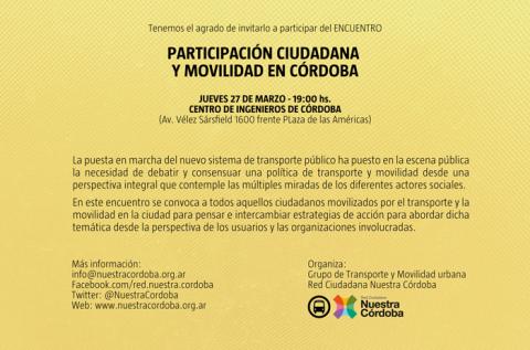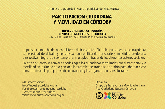 El Grupo de Transporte y Movilidad urbana Red Ciudadana Nuestra Córdoba invita al encuentro Participación Ciudadana y Movilidad en Córdoba que se realizará el próximo jueves 27 de marzo a las 19:00 en el Centro de Ingenieros de Córdoba (Av. Vélez Sársfield 1600 frente Plaza de las Américas).