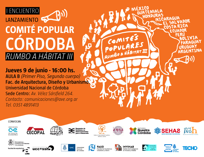 AVE – CECOPAL – CISCSA – Red Encuentro de Entidades No gubernamentales para el Desarrollo – HIC América Latina – La Minga – Nuestra Córdoba – SEHAS – Serviproh – Servicio Sociohabitacional de la FA (Universidad Católica de Córdoba) - Instituto de Investigación de la Vivienda y el Hábitat (INVIHAB) y Cátedra Problemática de la Vivienda Popular de la FAUDI (Universidad Nacional de Córdoba) – Escuela de Trabajo Social (UNC) – TECHO.