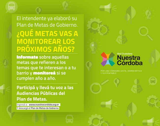 Descargá el Plan de Metas. Informate cuáles de aquellas metas refieren a tu barrio o tratan sobre los temas que te afectan, y monitoreá si se cumplen año a año. Participá y llevá tu voz a las Audiencias Públicas del Plan de Metas.