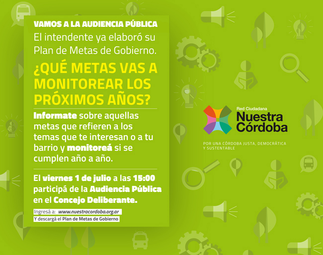 La Red Ciudadana Nuestra Córdoba impulsa la iniciativa ¿Qué metas vas a monitorear?, con el objetivo que organizaciones y colectivos de la ciudad de Córdoba conozcan el Plan de Metas del Intendente y puedan monitorear durante los próximos años algunas metas que aborden los temas que le ocupan, o bien señalar aquellos que, desde su perspectiva, no hayan sido incorporados al mismo.