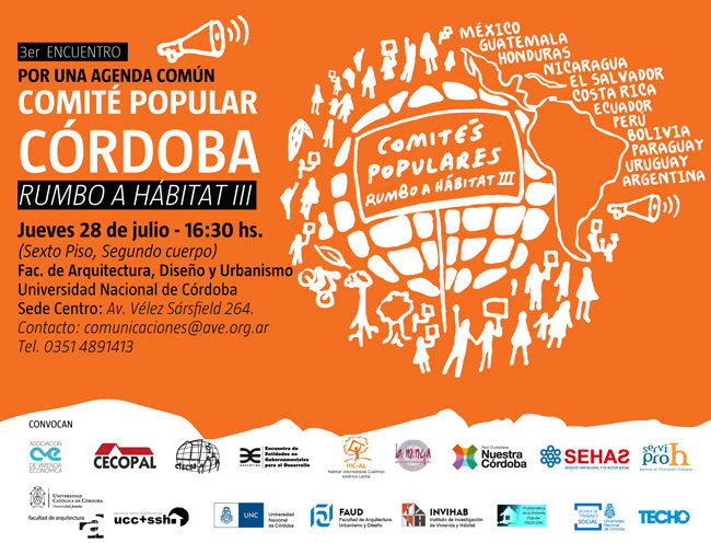 El jueves 28 de julio a las 16:30, en el Sexto piso del segundo cuerpo de la Facultad de Arquitectura, Urbanismo y Diseño de la Universidad Nacional de Córdoba, en su sede del centro en Av. Vélez Sarsfield 264, se llevará a cabo el 3er Encuentro del Comité Popular Córdoba.