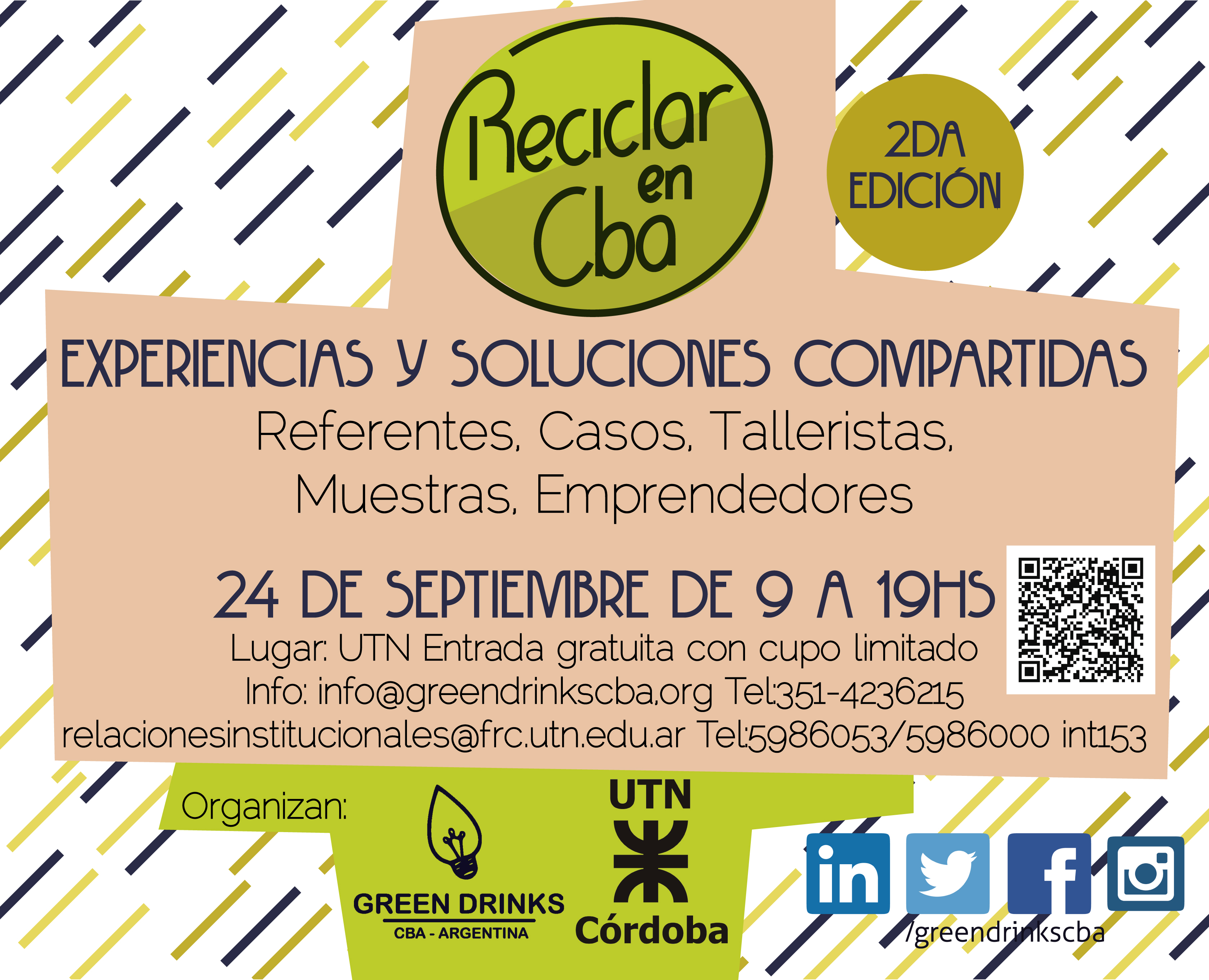 La Jornada “Reciclar en Córdoba”, realizada el 24 de septiembre en la Universidad Tecnológica Nacional está enfocada en el desarrollo de herramientas que den respuesta a la problemática de residuos generando oportunidades, tecnologías e intercambios para promover el reciclaje en la ciudad de Córdoba. Contó con la participación de referentes del reciclaje, disertantes con casos de éxito, propuestas de emprendedores, talleres, muestras y networking.