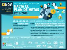 El jueves 13 de noviembre, de 14:00 a 20:00, la Red Ciudadana Nuestra Córdoba realizará el IV Foro de Nuestra Córdoba. “Por una agenda ciudadana: Hacia el plan de metas 2015-2019”. En la primera parte del evento se desarrollarán sesiones de debate y reflexión sobre el desarrollo de la ciudad en relación a 3 ejes: Desarrollo urbano sustentable; Desarrollo inclusivo y Desarrollo institucional. Luego se presentarán experiencias de incidencia en políticas públicas de Brasil, Chile y Argentina, Lugar: Universidad Católica de Córdoba (Ob. Trejo, 323).