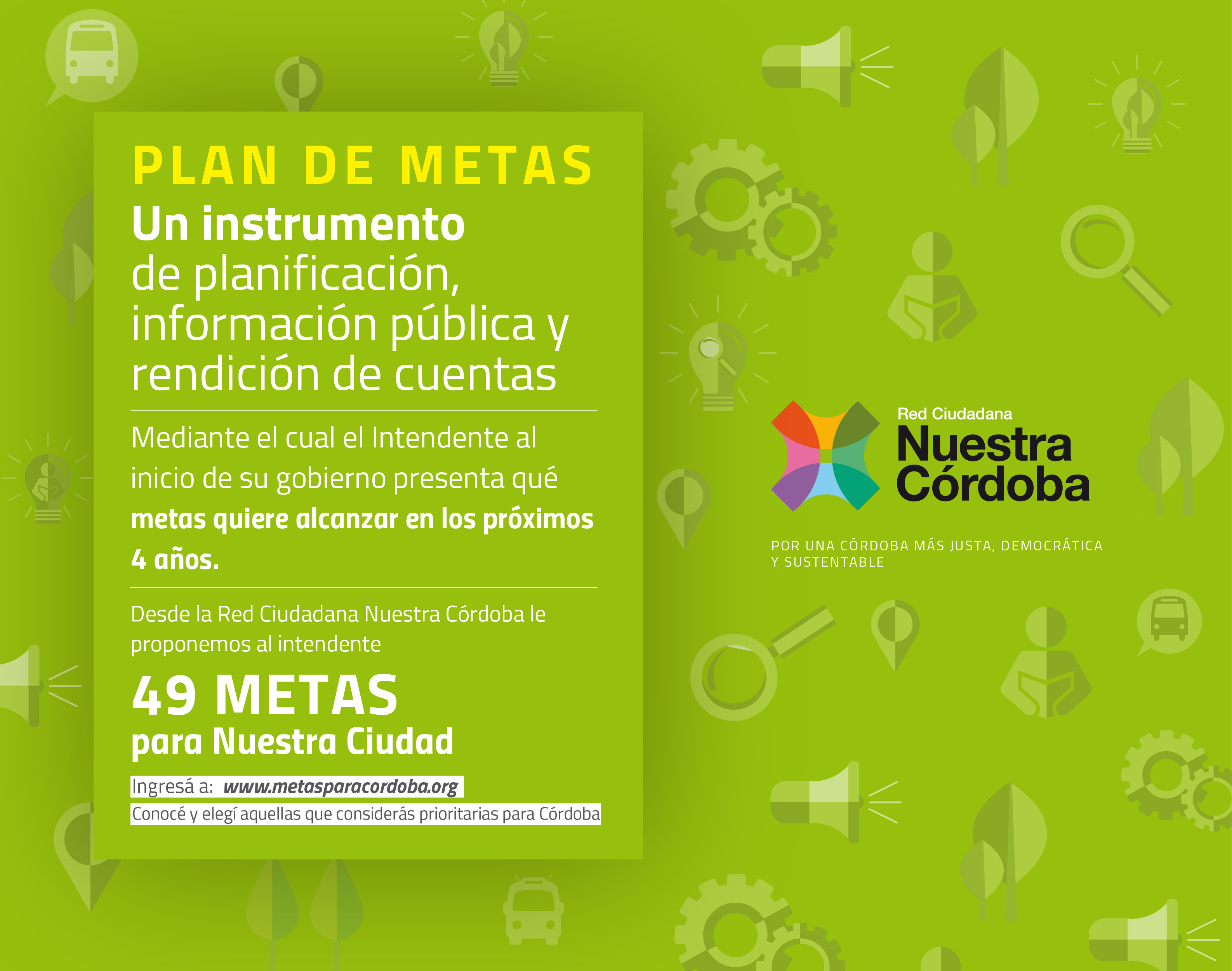 Desde la Red Ciudadana Nuestra Córdoba elaboramos 49 Metas para Nuestra Ciudad, con el objetivo de poner en agenda, y proponerle al Intendente debatir acerca de algunas problemáticas prioritarias para la ciudad de Córdoba. También podés participar ingresando a: metasparacordoba.org, para conocer y votar por aquellas que considerás prioritarias para Córdoba.
